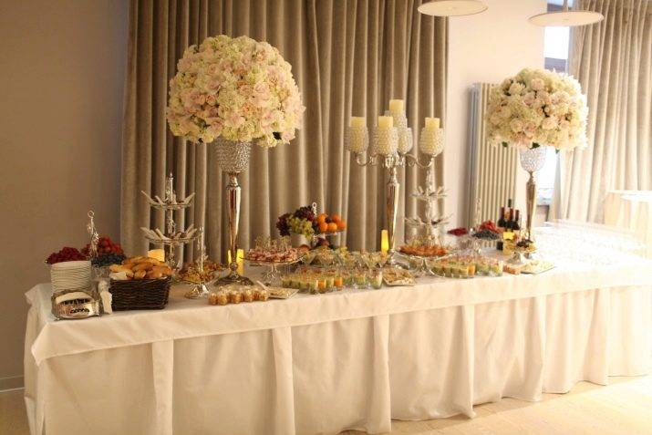 Столы лучше всего расставить в виде буквы Г или Ш. Блюда рекомендуется расположить на изысканных металлических подставках, так гостям будет удобнее доставать еду. Тарелки для гостей стоит расставить на пустующих местах. Посетители торжества их быстро разберут, и освободившееся пространство будет функциональным.