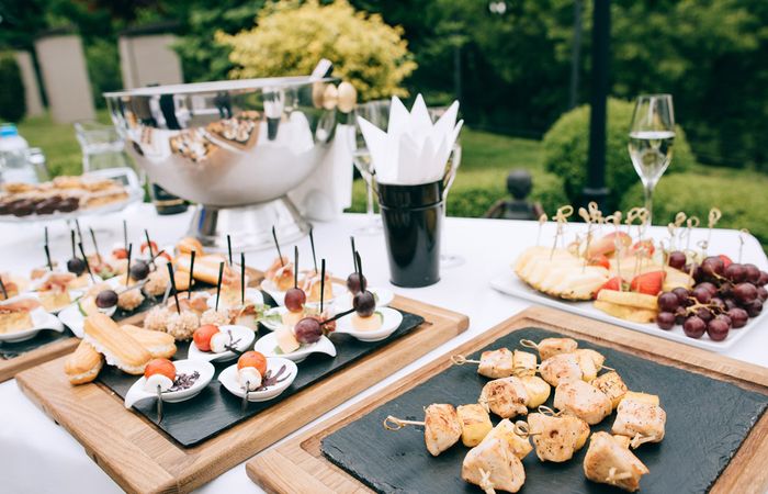Летнюю свадьбу можно устроить не только в кафе или ресторане. Если погода благоволит будущим молодоженам, то банкет можно перенести на природу. В этом случае можно нанять агентство по кейтерингу, сотрудники которого доставят все продукты к месту празднования и красиво расставят все блюда на столах. Жених и невеста могут сделать это и самостоятельно – это займет больше времени, но выйдет экономичнее.