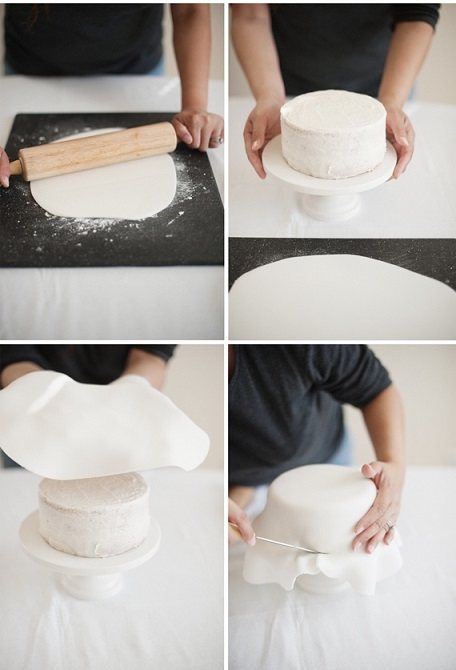 Когда крем схватился, будущий торт достается из холодильника и обтягивается тонким слоем мастики. Края приглаживаются, чтобы нигде не было складок, заломов и пузырьков.