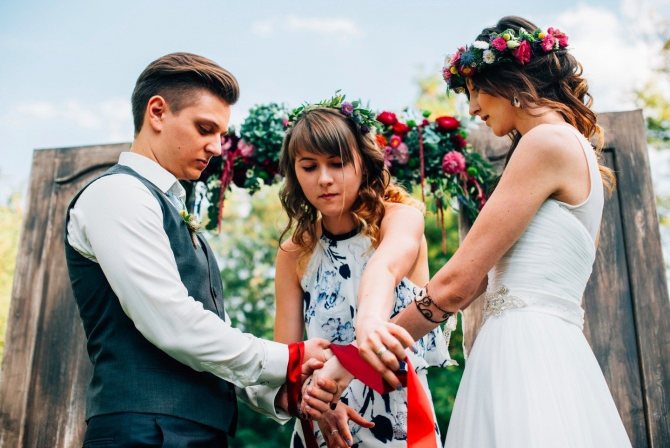 Это позволит вам не только удивить гостей, но и добавить в этот момент еще больше трогательных и искренних эмоций. Можно зажечь семейный очаг, устроить песочную церемонию (когда молодожены пересыпают песок из двух сосудов в один общий), церемонию «tie the knot» (когда руки жениха и невесты связываются символическим узлом) или даже посадить дерево (если площадка не позволяет – комнатное растение или цветок).