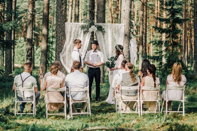А если церемония будет длиться не дольше 20 минут, можно провести ее стоя – своеобразный «фуршетный» вариант. Но в этом случае все равно обязательно предусмотрите сидячие места для пожилых гостей и предупредите девушек, чтобы подбирали удобную обувь (особенно если церемония пройдет на природе).