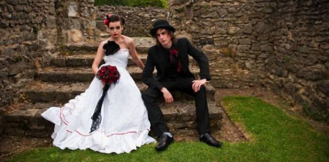 Романтическое, чаще короткое платье А-силуэта легко дополнить «рокерскими штучками»: заклепками, шипами, черными перчатками, толстыми шнурками на корсете, своеобразной шляпкой, вуалью, аксессуарами из кожи или металлической фурнитурой. Темные пиджаки или куртки из кожи, грубое кружево на лифе, или цветная тесьма на талии, стильные, массивные украшения на волосах позволяют девушке предстать в ярком образе рокерши или байкерши. Друзья рок-молодоженов воспримут весь такой экзотический образ на «ура».