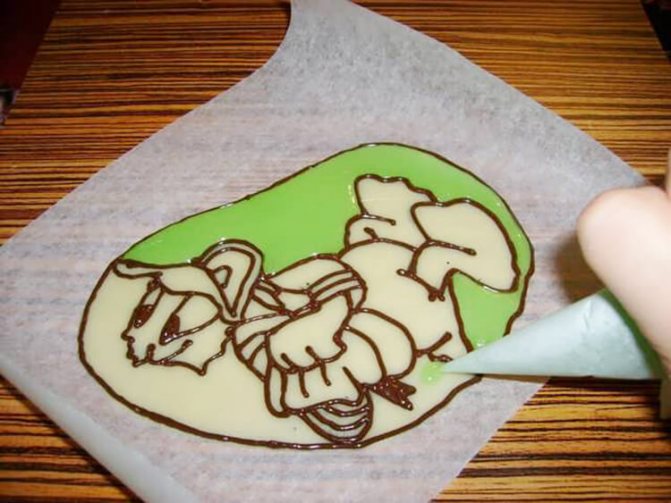 Процесс приготовления: возьмите пергаментную бумагу и нарисуйте простым карандашом изображение. Раскатайте на пергаменте слой мастики либо марципана тонким слоем. Перенесите на него картинку, приложив лист и раскатав скалкой. Растопите 50 грамм тёмного шоколада, затем поместите в кондитерский шприц. Про рисуйте шоколадом контур рисунка. Растопите цветной материал в разных ёмкостях, это можно сделать на водяной бане либо в микроволновке. Залейте рисунок нужными цветами мармелада. Поставьте в холодильник на 3 часа. Также торт можно украсить не растопленным мармеладом разных форм. Из долек цитрусовых и кубиков можно сделать цветы. Поверхность торта для украшения не растопленным мармеладом должна быть липкая, например – масляный крем, взбитые сливки.