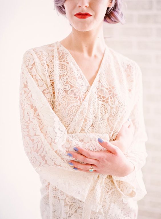 Невесты предпочитают белый, кремовый или бледно-розовый оттенки, но ничто не мешает тебе быть менее традиционной. Накидка может быть полностью кружевной или только с кружевной отделкой, или же с кружевным лифом и гладкими спиной и рукавами. Рукава в три четверти более удобны в носке, и если выберешь колокольчики, добавишь нотку романтичности к своему утреннему луку.