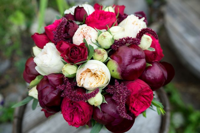Винная свадьба не требует от букета невесты чего-то необычного. Выбор цветов винных оттенков огромен. Их можно разбавить ягодами и виноградом. Опытный флорист сможет создать красивую композицию.