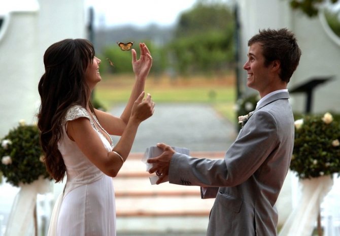 Этот вариант не совсем подходит под термин “осыпание”, но тем не менее, достойная альтернатива давней традиции. Выпустить птиц, а ещё эффектней – бабочек в небо и так красиво закончить официальную часть торжества. Выбрав такой вариант, вы точно выделитесь на фоне других пар. Советик: если захотите провернуть фокус с бабочками, пусть это будет сюрпризом для всех присутствующих. Подготовьте именные коробочки для гостей и раздайте их после церемонии. И только потом откройте секрет, что сейчас будет происходить по сценарию! Плюс один в копилочку ярких эмоции, полученных гостями на вашем свадебном празднике.