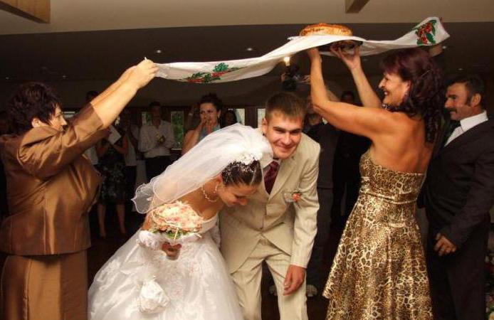 Затем в действо вступают родители невесты. Новоиспеченная теща угощает дочь и зятя медом и желает им долгой жизни и бесконечного медового месяца. А тесть, отец невесты, подносит им шампанское. Бокалы осушают до дна и разбивают «на счастье». Согласно традиции молодым могут перевязать руки рушником, что будет символизировать их долгий совместный путь.