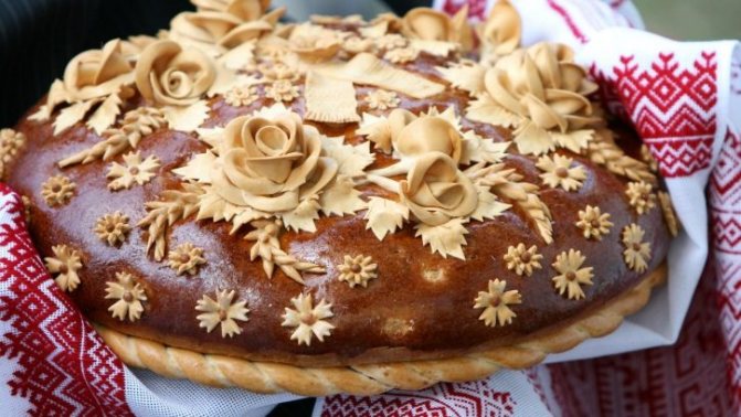 Так хлеб насыщался положительной энергетикой. Каравай выпекали с тремя ярусами. Верхний слой предназначался молодоженам, средним угощали гостей, а нижняя часть (в давние времена там запекались монеты) отдавалась музыкантам. Украшения каравая также несли особый смысл, и каждый элемент обозначал что-то желаемое: