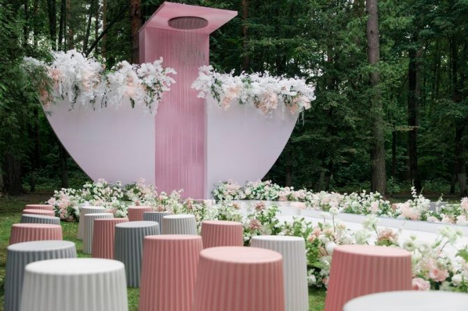 Все декорации готовятся заранее: арка, стулья для гостей, подушечка для колец, ручка для росписи и т.д Подразумевается, что всем этим заведует один человек — свадебный декоратор.