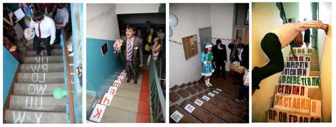 - На ступеньках пишутся разные буквы, жених должен, поднимаясь по ступенькам, говорить ласковые слова невесте, начинающиеся на эту букву.