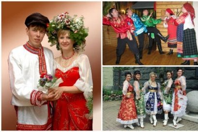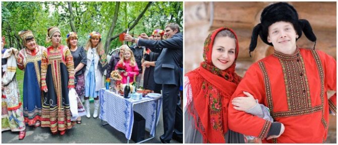 Русская свадьба будет не совсем таковой, если приглашенные гости не будут облачены в старинные костюмы. Противники таких тематических торжеств могут использовать лишь элемент традиционного наряда. Например, девушки могут украсить головку венком из полевых цветов, заплести косы с атласной лентой алого цвета, повязать красивый платочек, надеть красные туфли. Мужская половина гостей может использовать красный галстук или вставить в петлицу платок с традиционным русским узором. Чтобы облегчить гостям подготовку к свадьбе в русском стиле, жених и невеста могут сами взять для них напрокат все необходимые аксессуары.