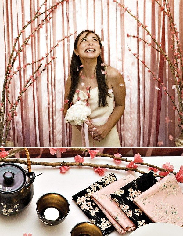 Цветовая гамма должна быть нежной, в розовых или белых тонах. Столы можно украсить свечами, печеньем с предсказаниями, веточками сакуры. Стены обычно украшают оригами, японскими масками, веерами и изображениями Японии.