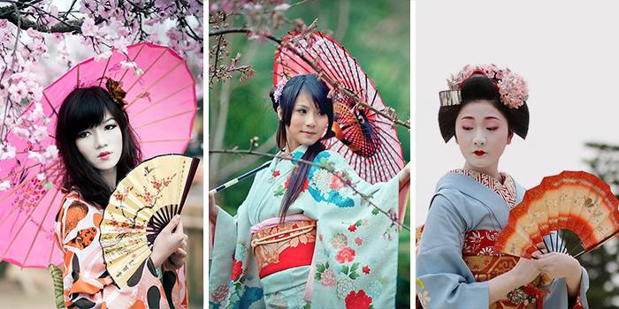 - Зонтик — традиционный и очень древний атрибут, пришедший с Индии. Символизируя защиту от всякого зла, зонтик стал неотъемлемой частью японской культуры и, к тому же, защитой от солнечных лучей, ведь бледная кожа — эталон японской красоты. В самых разных цветах в зависимости от наряда зонтик украсит любую даму, добавив национальной самобытности образу.
