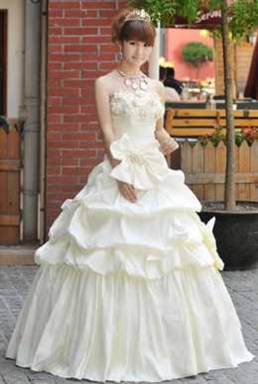 Прекрасную коллекцию пышных японских свадебных нарядов создал дизайнер Yoko Оgura. Разнообразие цветов, отделки и фактур его моделей поражает. Легкие и многослойные желтые, голубые юбки с воланами помогут создать утонченный и воздушный образ новобрачной. А отделка наряда искусственными цветами, которые расположены так, как будто их разбросали по ткани, выглядит необычно и романтично.