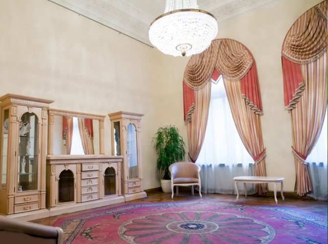 В малый зал дворца бракосочетания номер 1 гости входят через золотую гостиную, а молодожены через комнату ожидания.