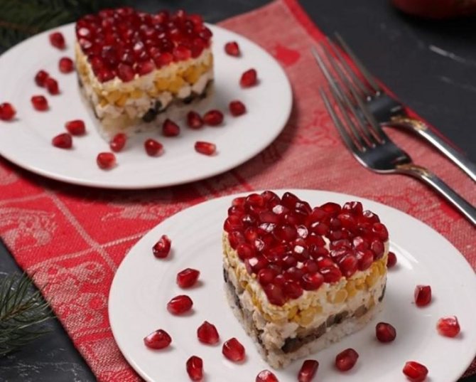 - салаты с его зернышками – «Шапка Мономаха», «Гранатовый браслет», «Фруктовый», «С курицей», «Красная шапочка», «Рубиновый», с хурмой и пекинской капустой;