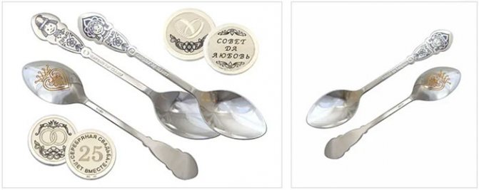 - Подарить на серебряную годовщину свадьбы можно приборы с литыми ручками. То есть на ручках выливаются любые формы, будь это сердечки или ветки с дубовыми листами.