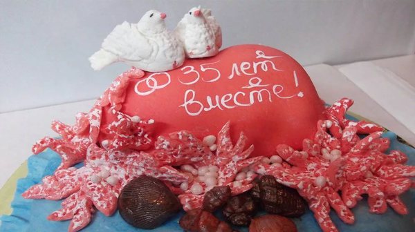 Чтобы сформировать идеальный отдых, необходимо учитывать не только варианты и образы. Важно обращать внимание на такие детали, как сервировка стола и оформление меню. Главным блюдом и главным героем вечера станет свадебный торт. К тому же это считается незабываемым завершением свадебного мероприятия. Заказывая торт, важно рассчитать, чтобы его хватило на всех гостей. Сладость, выполненная ярусами, добавит торжеству роскоши. Верх торта может быть украшен цифрой 35 мастикой или съедобными миниатюрными фигурками «молодоженов.