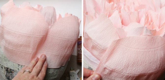 - Теперь каждый лепесточек нужно в его широкой части растянуть, в основания скрутить, чтобы было удобно их приклеивать к заготовке папье-маше. Приклеиваем с помощью термопистолета: