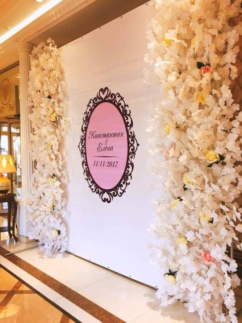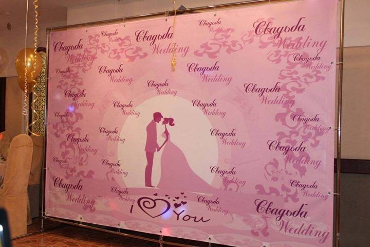 - Многофункциональность. Баннеры на свадьбу являются отличным вариантом для создания фона на фотографии. На нем можно разместить любую задумку.