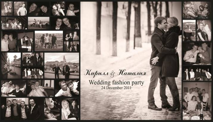 Это один из наиболее популярных вариантов. Для оформления понадобятся фотографии молодых до свадьбы. Обычно заказывается специальная фотосессия, но если ее не было – подойдут фото из личного архива. Такой коллаж позволит проследить историю любви новоиспеченных супругов. Love story можно разнообразить надписью с датой свадьбы, а после мероприятия украсить баннером интерьер своего дома.