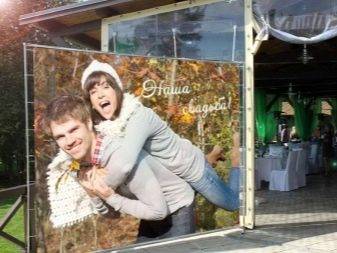 Молодожены с чувством юмора могут предложить своим гостям необычный баннер, на котором будет выполнена полномасштабная карикатура на них или будут присутствовать специальные выемки под лица, благодаря которым гости смогут «примерить» на себя их образы. Такой стенд поднимет настроение и украсит торжество еще большим количеством положительных эмоций.