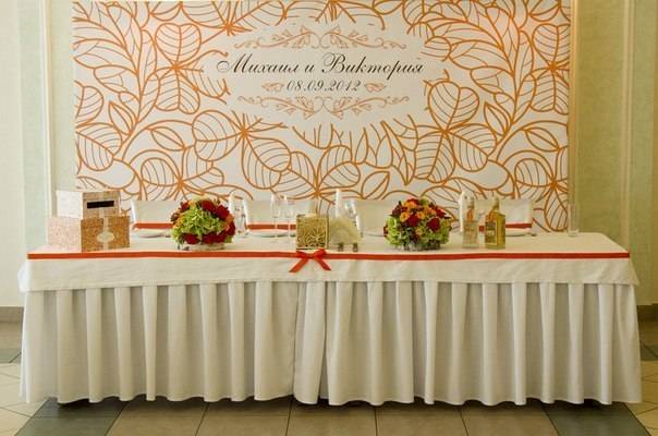 - Расцветка. Если вы хотите подобрать красивый фон для фотосессии, постарайтесь отдавать предпочтение светлым неярким оттенкам, чтобы гости не терялись на фотографиях. Баннер в качестве элемента декора может быть довольно ярким и креативным, а ширма за столом молодых должна соответствовать общей цветовой гамме свадьбы.