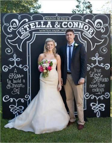 д) очень популярны печатные баннеры, имитирующие доску с текстом, написанным мелом. Хотя некоторые пары действительно умудряются установить на свадьбе меловую доску.