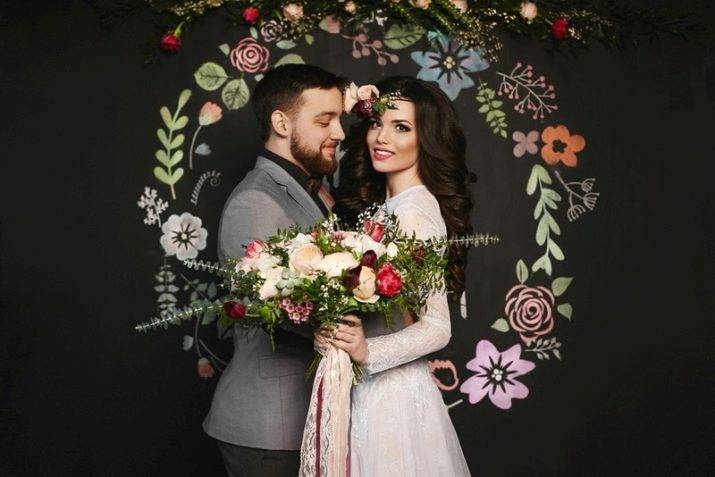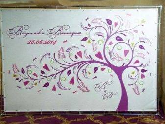 Большинство молодоженов отдает предпочтение индивидуальному оформлению. Таким образом, стенд точно будет соответствовать стилистике мероприятия и больше нигде не будет использован после. Для заказа специального баннера необходимо подобрать тему и рассмотреть несколько вариантов оформления полотна