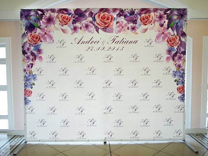 - Пресс-волл. Это один из самых распространенных баннерных полотен. Он предполагает сеточку мелких повторяющихся надписей, например, с именами супругов или изображений, соответствующих тематике и лаконично отражающих суть события. Такой баннер – универсальный вариант, поскольку сама концепция его построения предполагает наилучшие условия для акцента на людях. Это ненавязчивый информативный фон, подчеркивающий события. Заказать его можно в профессиональной студии, предоставив предварительный эскиз с вашими пожеланиями. А если вы обладаете навыками работы с компьютерными графическими программами – сделайте дизайн сами и распечатайте в типографии. Каркас можно изготовить из металлопластиковых труб, дерева или арендовать готовый.