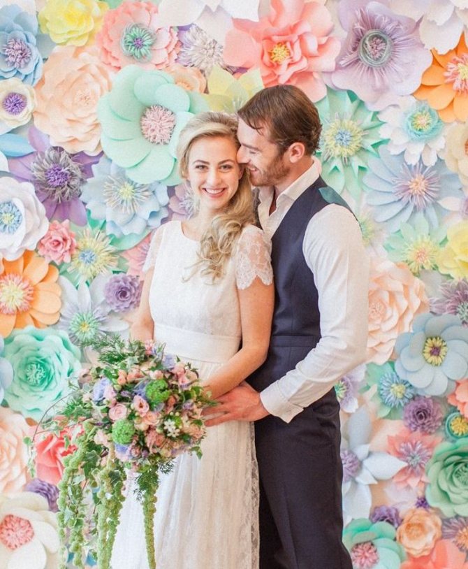 Это одна из трудоемких частей работы в создании пресс-вола своими руками. Фон можно сделать из бумаги или отрезка ткани – льна, брезента, байка. Подойдут даже обои, главное правило – цвет. Лучше, если это будет пастель или другие неяркие оттенки (бежевый или белый). Из ткани или бумаги можно сделать цветы, ленты, гирлянды. Их можно подвесить на веревке или на стене.