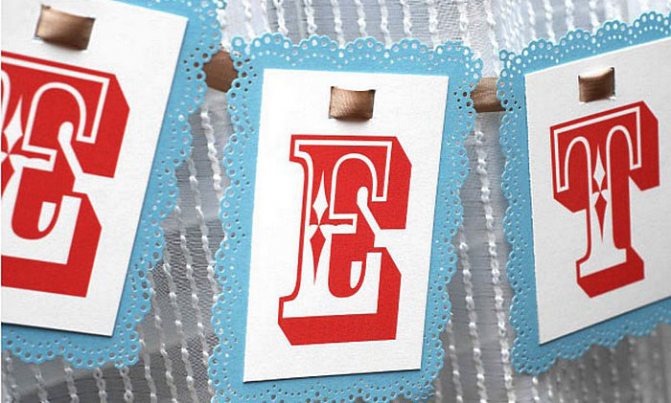 - Выберите в компьютере подходящий шрифт, размер и цвет для надписи, напишите и распечатайте буквы на принтере на белом картоне. Если нет возможности печатать на картоне, воспользуйтесь обычной писчей бумагой – в этом случае распечатанные заготовки надо будет наклеить на белый картон (иначе подложка будет просвечивать сквозь тонкую бумагу). Обрежьте края заготовок с буквами в соответствии с выбранным размером.