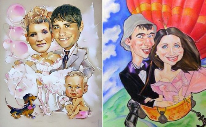 Плакат-шарж всегда вызывает улыбку и делает свадьбу неформальной, вносит нотку юмора и задора в серьезность торжества и остается молодоженам подарком на долгую память. Заказывают шарж у художника, как правило, по фотографии, позировать лично необязательно. Свадебный шарж можно распечатать любого размера, вставить в раму или закрепить как баннер.