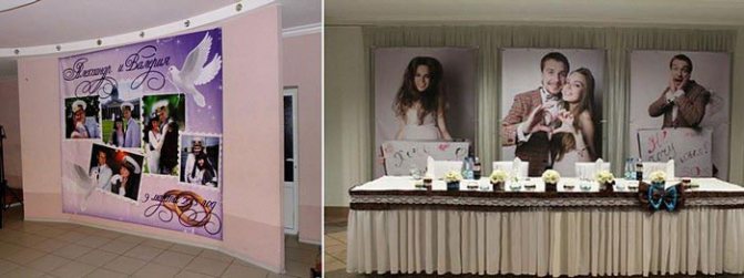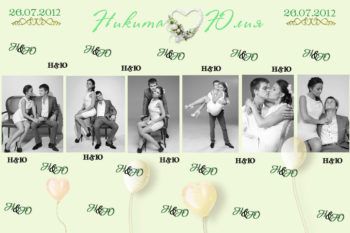 Это один из наиболее популярных вариантов. Для оформления понадобятся фотографии молодых до свадьбы. Обычно заказывается специальная фотосессия, но если ее не было – подойдут фото из личного архива. Такой коллаж позволит проследить историю любви новоиспеченных супругов. Love story можно разнообразить надписью с датой свадьбы, а после мероприятия украсить баннером интерьер своего дома.