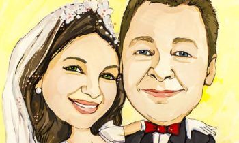 Интересно смотрятся варианты с шаржами. Стоимость такого баннера будет не очень высокой, до 3000 рублей. Главный плюс – для шаржа молодоженам не нужно позировать художнику, он может сделать рисунок и по фотографии.