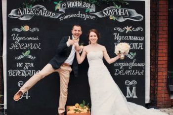 Многие фотографы предлагают молодоженам сделать фотографии оригинальными с помощью плакатов, шуточных рисунков или надписей, на фоне которых проводится фотосессия.