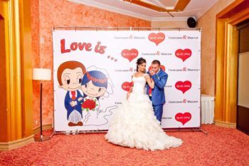 Баннер выполняет на свадьбе сразу несколько функций. Это одновременно оригинальный фон для фотографий и элемент декора в банкетном зале. С его помощью можно также заменить традиционную ширму за столом молодых супругов. Он поможет создать полноценную фотозону на свадьбу. Что еще для этого нужно, Вы можете прочитать в этой статье.