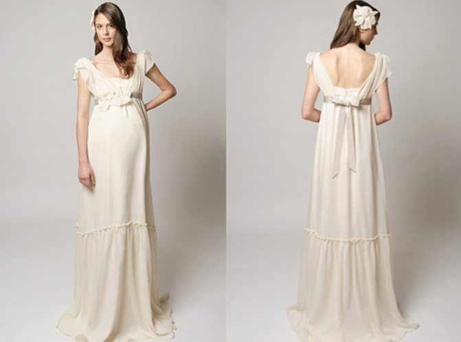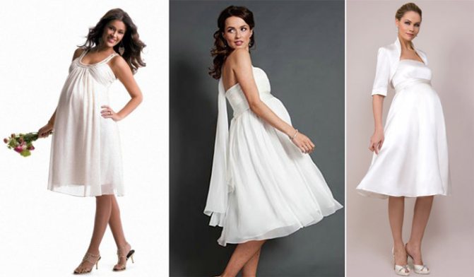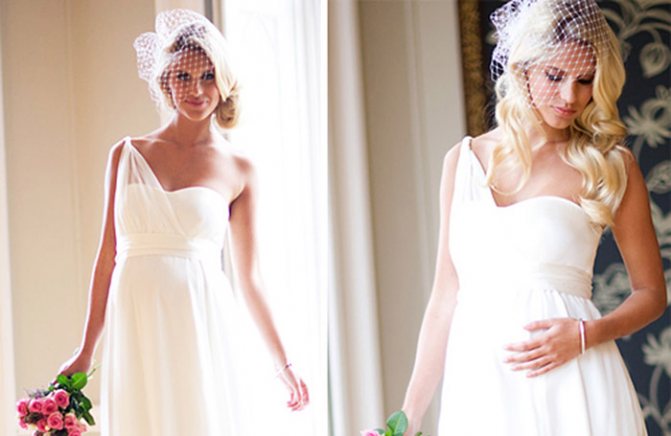 Беременная невеста должна тщательно подбирать фасон свадебного платья, чтобы во время празднования торжественного события чувствовать себя не просто безупречно, но и максимально комфортно. Классические силуэты «трапеция» или «ампир» идеально подойдут для невесты в положении. Такое платье невесты украшают элегантным атласным поясом, который подвязывают под грудью. Длина юбки может варьироваться от макси до коктейльного варианта чуть выше колена.