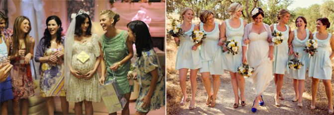 Выбирая платье, беременная невеста должна определиться в чём ей комфортнее будет гулять на собственной свадьбе: использовать и в первый, и во второй день просто нарядные платья, скрывающие живот, или всё-таки надеть белое подвенечное платье и фату невесты.