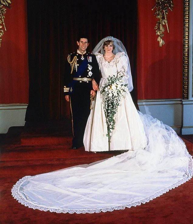 Платье принцессы Дианы было отделано 10 000 жемчужин, ручной вышивкой, кружевом и пайетками и имело 25-футовый шлейф. Наряд шили на 6 фабриках, а потом собирали воедино в ателье. Туфли невесты тоже заслуживают упоминания. Они были сделаны из шелка и слоновой кости и украшены 132 жемчужинами и пайетками. На их изготовление ушло 5 месяцев.