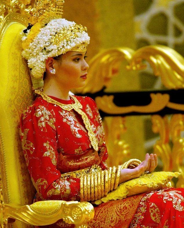 Свадьба наследника султаната Брунея Аль-Мухтади Билла и его 17-летней швейцарской жены Сары Салле блистала в прямом смысле слова. Один только букет невесты был выполнен из золотых нитей и бриллиантов. Передвигались молодые на золотом Роллс-Ройсе султана Брунея. А среди гостей на свадьбе были главы азиатских государств.