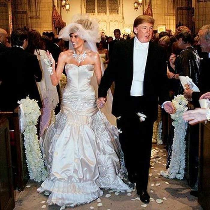 В 2004 году Трамп сделал предложение, Мелания дала согласие. 22 января была их свадьба у моря в Палм-Бич. Венчание было в Епископальной церкви, наряд для него изготовил Джон Гальяно, который на тот момент работал в Dior. Оно было сшито из белоснежного атласа, узоры вышивались вручную.