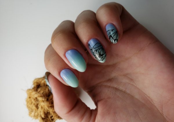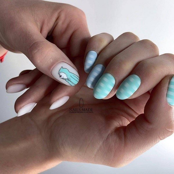 Нежный омбре маникюр у вас может получиться при помощи полосок градиента, чередующихся друг с другом. Модный тренд сезона – это использование разного дизайна на каждой ручке – на одной можно создать полосатый омбре эффект, а на большом пальчике другой выполнить какой-нибудь милый рисунок — в нашем случае мишка с капюшоном на голове. С таким градиентным маникюром вам уж точно не придется скучать!