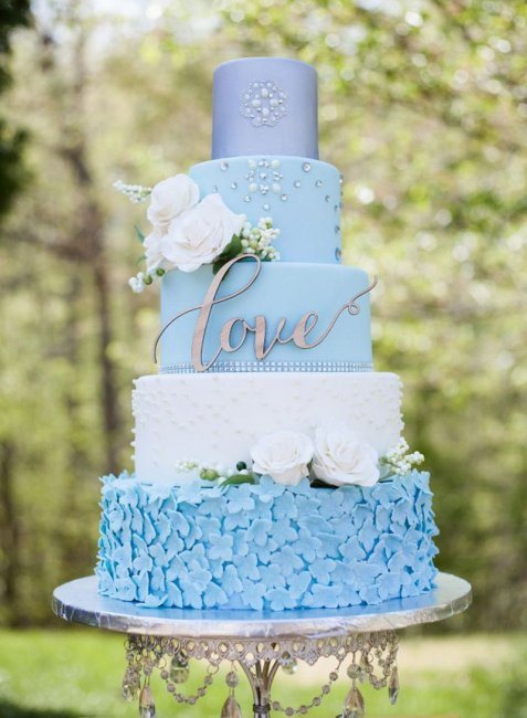 Если вы не знаете, чем украсить свадебный торт в голубом цвете, попробуйте задекорировать его съедобным кружевом белого цвета или цветами, живыми или сделанными из крема.