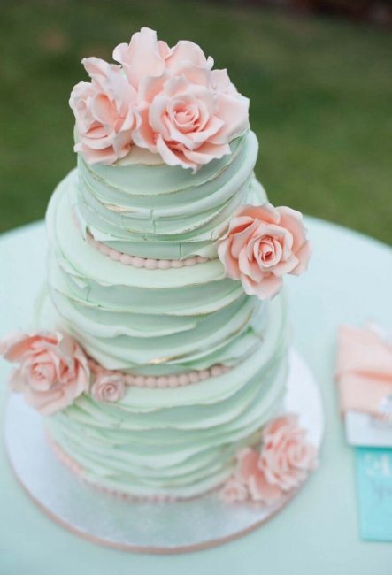 Если вы подыскиваете необычный и модный оттенок для торта, свадебный десерт мятного цвета станет для вас отличным решением. Этот цвет прекрасно гармонирует с розовым или золотым: такое сочетание позволяет сделать лакомство невероятно изысканным и утонченным. Украсить торт на мятную свадьбу можно с помощью зеленых растений, к примеру, флердоранжа или мелиссы.