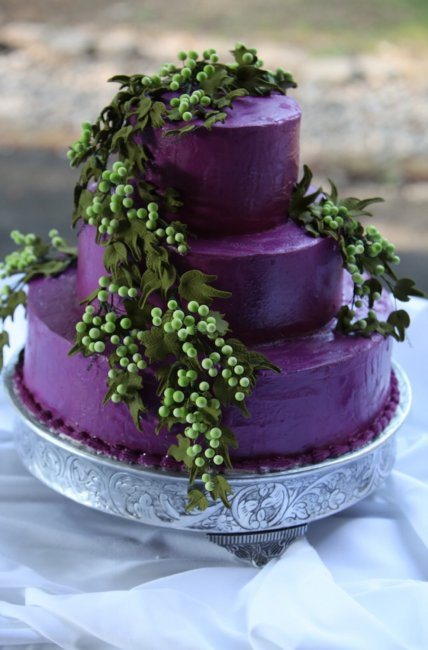Фиолетовый свадебный торт можно украсить сочными ягодами и фруктами: ежевикой, черникой, виноградом или сливами. Также часто фиолетовые десерты украшают лентами в тон или живыми цветами, например, орхидеями.