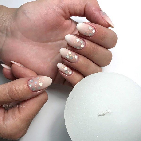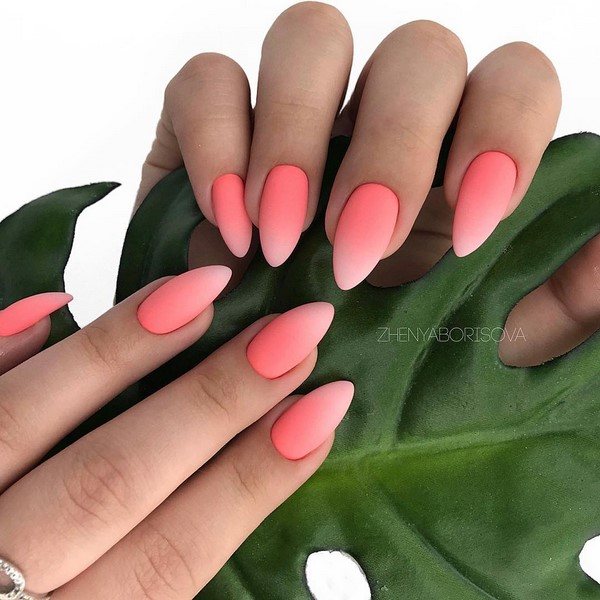 Главный тренд модного омбре маникюра в этом сезоне – это матовый топ или использование матовых гель-лаков, без которых получить большинство трендовых типов нейл-арт дизайна в данной технике не получится. Особенно эффектно смотрится неоновый матовый градиент, а также нежнейший нюдовый омбре маникюр в матовом дизайне. В обеих случаях можно использовать сверкающие украшения для ногтей, что на контрасте с матовым эффектом будут выразительней.
