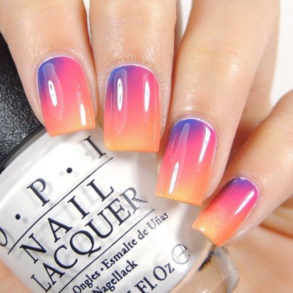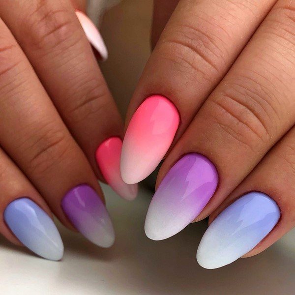 Игривый и милый маникюр омбре можно сделать при помощи разноцветных гель-лаков в нежной пастельной гамме, что в градиентной технике смотрятся очень стильно. С таким разноцветным градиентным маникюром вам обеспечено хорошее настроение.