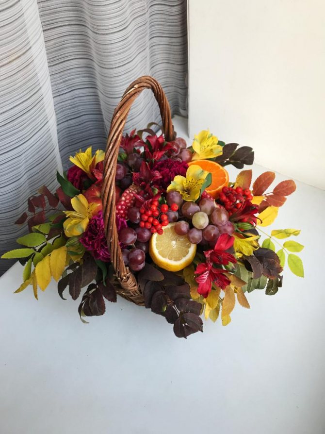 - Комбинация состоит из фруктов, ягод, шишек, установлена в тыкве (подойдет кабачок).