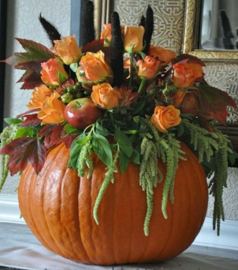 Мы не волшебники, но тыква нам отлично подойдет для создания вазы. В таком сосуде с водой цветы простоят долго, но их нужно укрепить. Помогут флористическая губка, более мелкая емкость, помещенные в овощ.